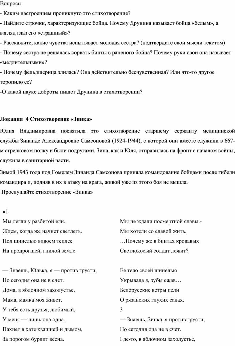 Локация 4 Стихотворение «Зинка»