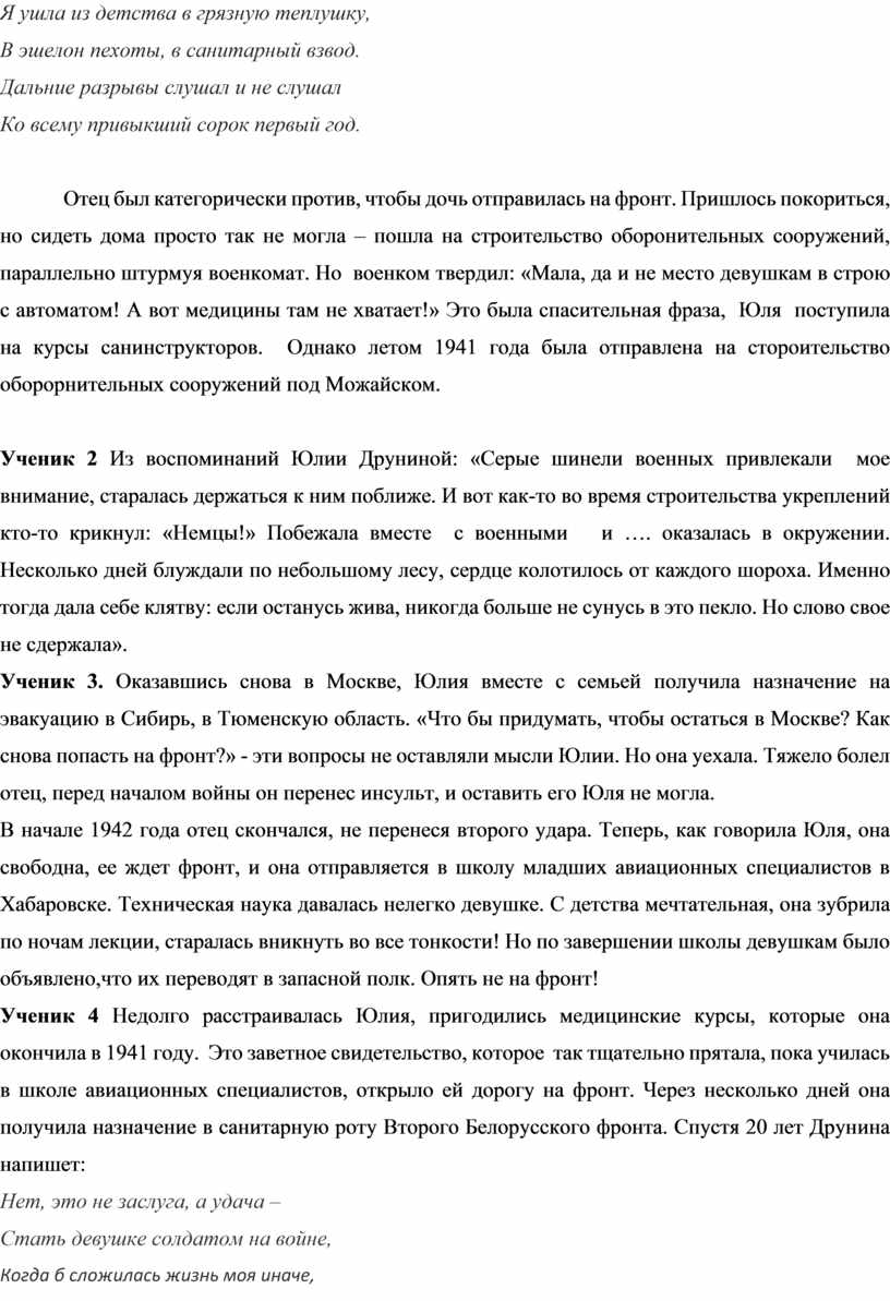 Ученик 4 Недолго расстраивалась Юлия, пригодились медицинские курсы, которые она окончила в 1941 году. Это заветное свидетельство, которое так тщательно прятала, пока училась в школе авиационных специалистов, открыло ей дорогу на фронт. Через несколько дней она получила назначение в санитарную роту Второго Белорусского фронта. Спустя 20 лет Друнина напишет: