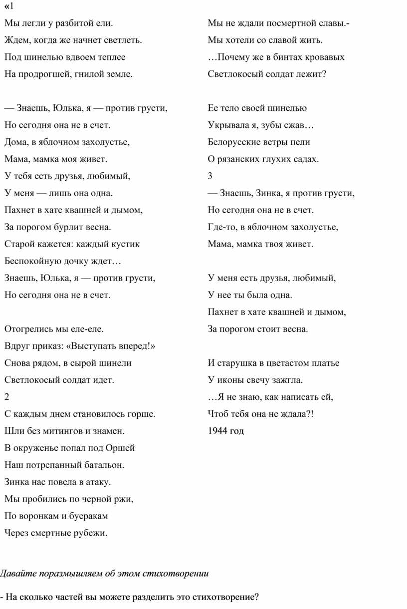 - Часть 3 очень похожа на 1, повторяются слова. Как меняется тональность стихотворения? В конце стихотворения появляется образ матери, которой Юля должна написать о смерти дочери. Как вы думаете, это только образ мамы Зины Самсоновой?