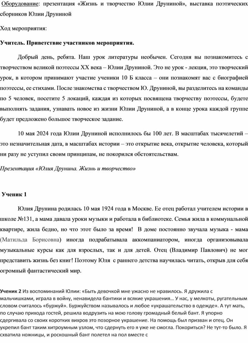 Форма проведения мероприятия необычна для учеников 7 класса. В начале урока подготовленные ученики 10 класса знакомят учащихся с биографией Ю. Друниной, рассказывают интересные факты, читают стихи. Вторая часть урока - творческая. Ученики делятся на 5 групп (по 5 человек). Старшеклассники образуют в классе 5 локаций, каждая из которых посвящена творчеству поэтессы. Каждая группа посещает эти локации, выполняет предложенные задания. В конце урока группы получают творческое задание. После всех награждают небольшими сувенирами - закладками со строчками из стихотворений Ю. Друниной.