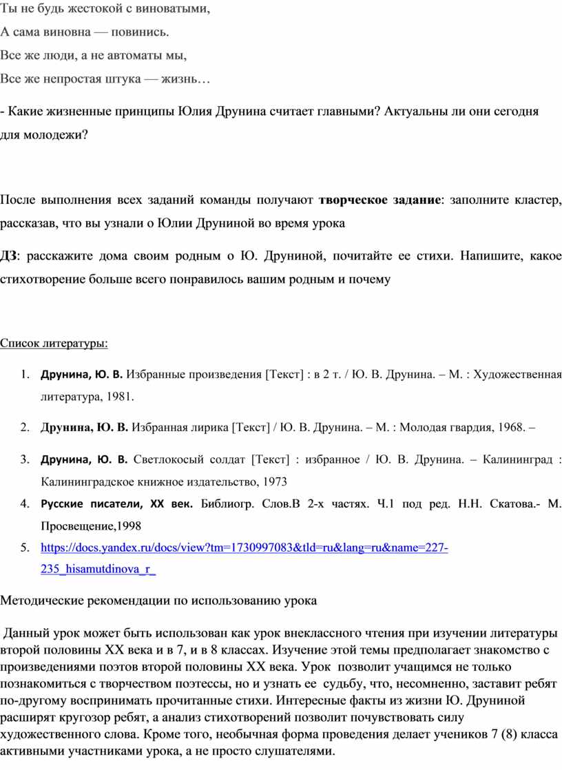Данный урок может быть использован как урок внеклассного чтения при изучении литературы второй половины ХХ века и в 7, и в 8 классах. Изучение этой темы предполагает знакомство с произведениями поэтов второй половины ХХ века. Урок позволит учащимся не только познакомиться с творчеством поэтессы, но и узнать ее судьбу, что, несомненно, заставит ребят по-другому воспринимать прочитанные стихи. Интересные факты из жизни Ю. Друниной расширят кругозор ребят, а анализ стихотворений позволит почувствовать силу художественного слова. Кроме того, необычная форма проведения делает учеников 7 (8) класса активными участниками урока, а не просто слушателями.