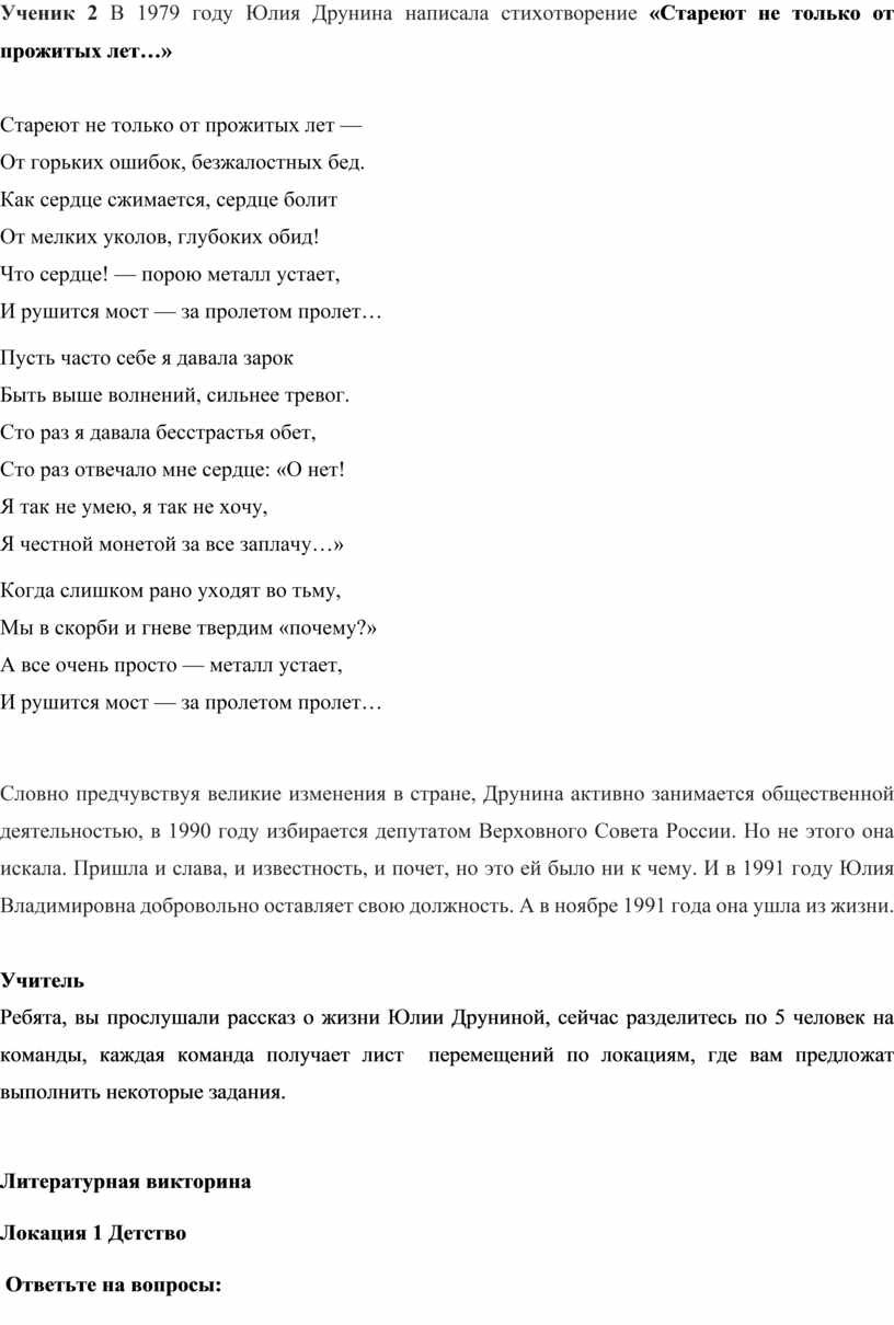 Ученик 2 В 1979 году Юлия Друнина написала стихотворение «Стареют не только от прожитых лет…»