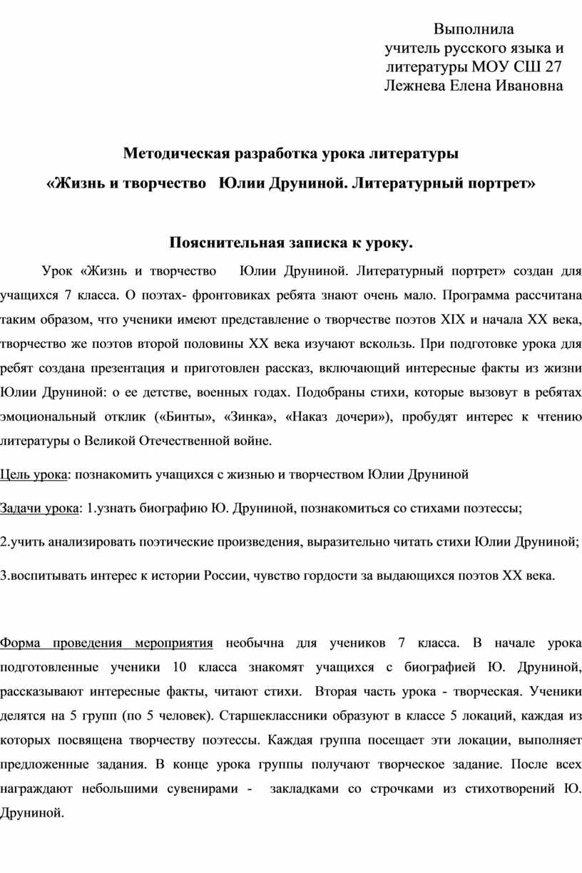 Урок «Жизнь и творчество Юлии Друниной. Литературный портрет» создан для учащихся 7 класса. О поэтах- фронтовиках ребята знают очень мало. Программа рассчитана таким образом, что ученики имеют представление о творчестве поэтов ХIХ и начала ХХ века, творчество же поэтов второй половины ХХ века изучают вскользь. При подготовке урока для ребят создана презентация и приготовлен рассказ, включающий интересные факты из жизни Юлии Друниной: о ее детстве, военных годах. Подобраны стихи, которые вызовут в ребятах эмоциональный отклик («Бинты», «Зинка», «Наказ дочери»), пробудят интерес к чтению литературы о Великой Отечественной войне.