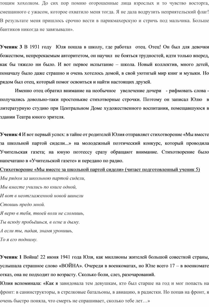 Ученик 4 И вот первый успех: в тайне от родителей Юлия отправляет стихотворение «Мы вместе за школьной партой сидели...» на молодежный поэтический конкурс, который проводила Учительская газета; на юную поэтессу сразу обращают внимание. Стихотворение было напечатано в «Учительской газете» и передано по радио.