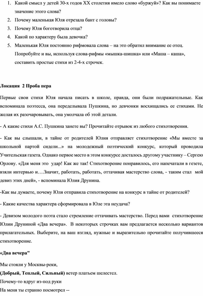 Ребята, вы прослушали рассказ о жизни Юлии Друниной, сейчас разделитесь по 5 человек на команды, каждая команда получает лист перемещений по локациям, где вам предложат выполнить некоторые задания.