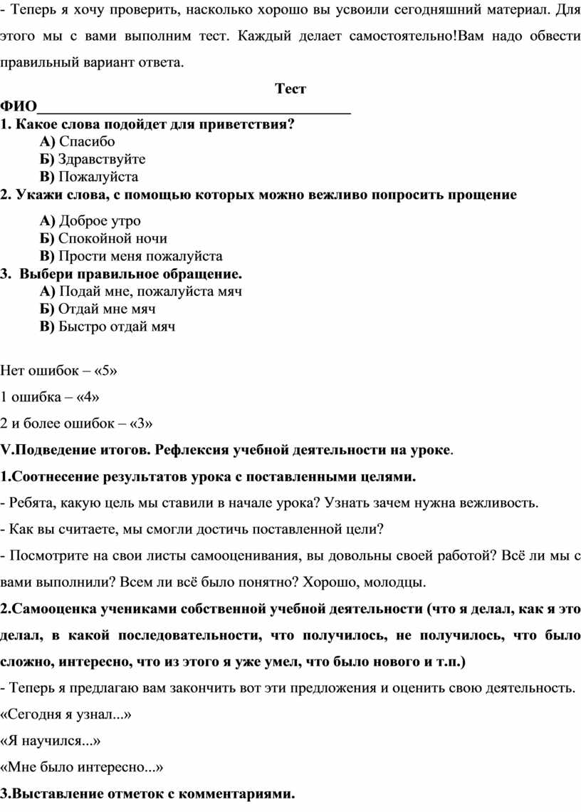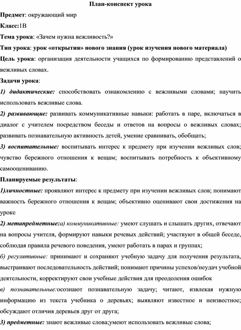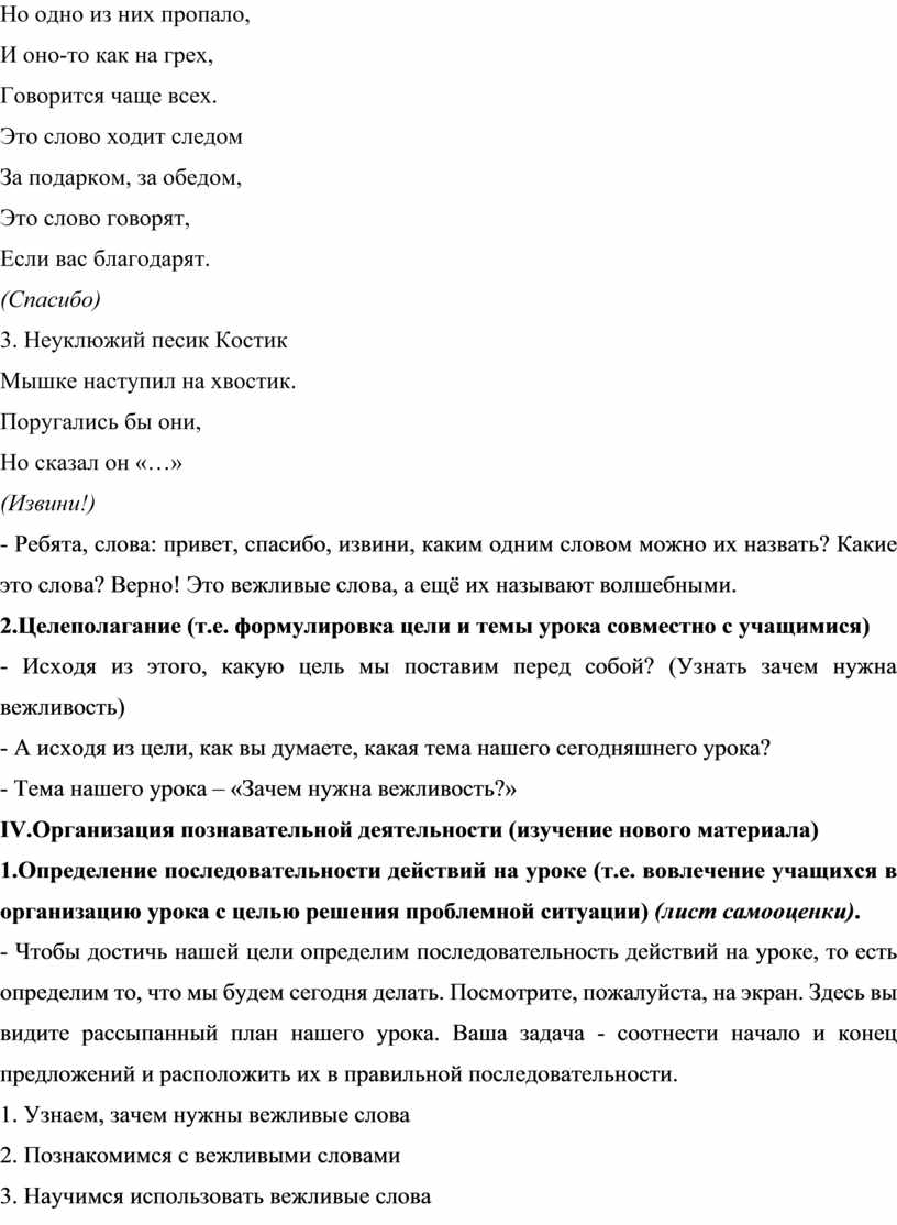 3) воспитательные: воспитывать интерес к предмету при изучении вежливых слов; чувство бережного отношения к вещам; воспитывать потребность к объективному самооцениванию.