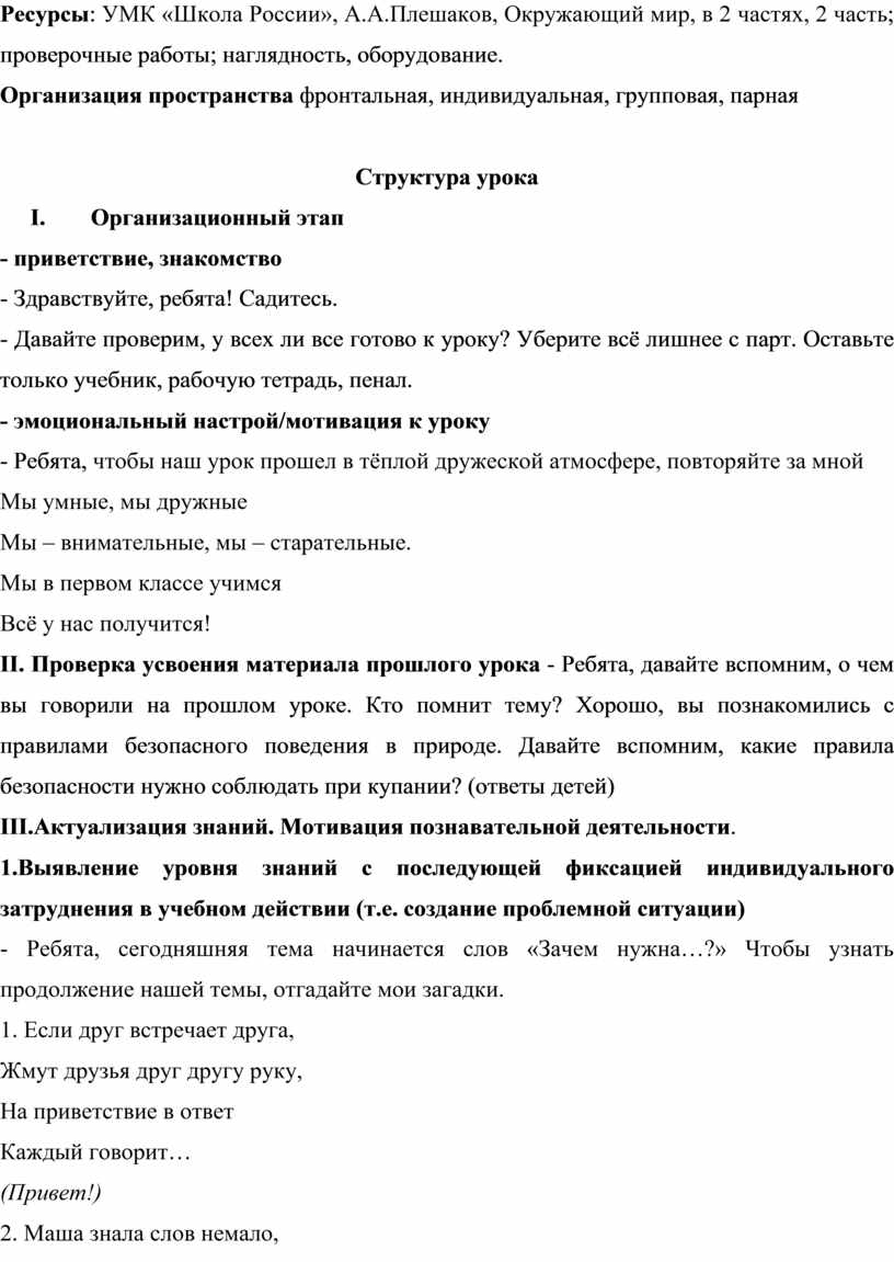 Ресурсы: УМК «Школа России», А.А.Плешаков, Окружающий мир, в 2 частях, 2 часть; проверочные работы; наглядность, оборудование.