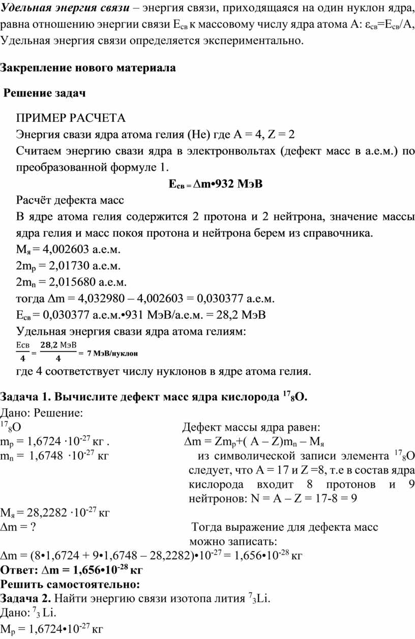 Энергия связи – минимальная энергия, которую необходимо затратить для полного расщепления ядра на отдельные нуклоны или энергия, выделяющаяся при слиянии свободных нуклонов в ядро. Расчетная формула энергии связи: