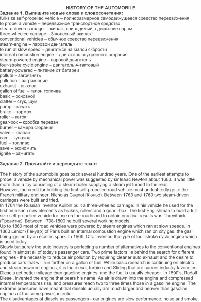 In 1784 the Russian inventor Kulibin built a three-wheeled carriage. In his vehicle he used for the first time such new elements as brakes, rollers and a gear –box. The first Englishman to build a full-size self-propelled vehicle for use on the roads and to obtain practical results was Threvithick (Тревитик). Between 1798-1800 he built several working models.