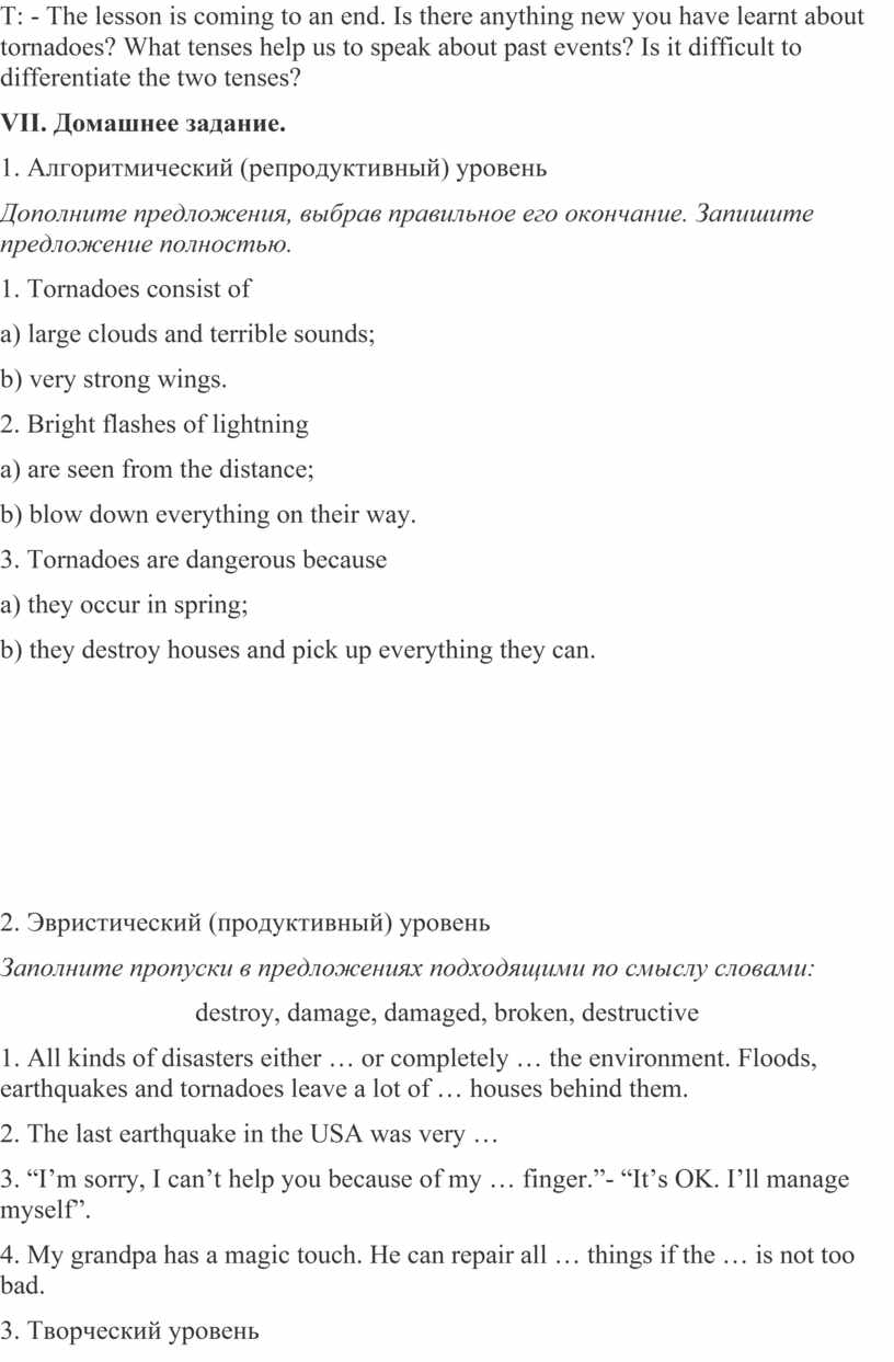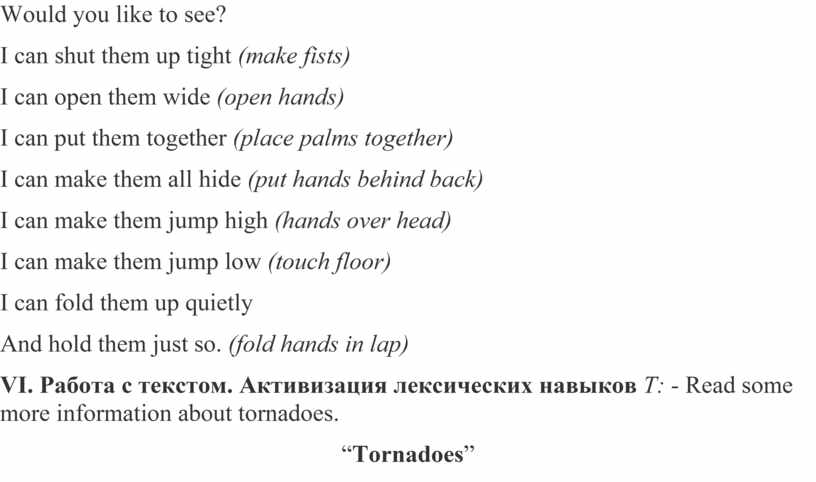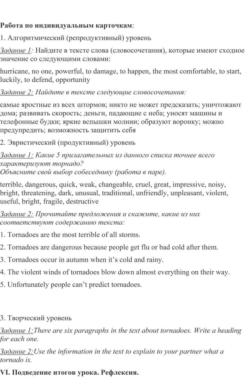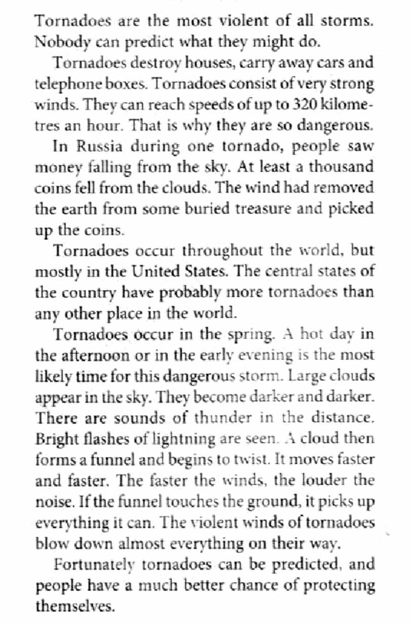 VI. Работа с текстом. Активизация лексических навыков Т: - Read some more information about tornadoes.