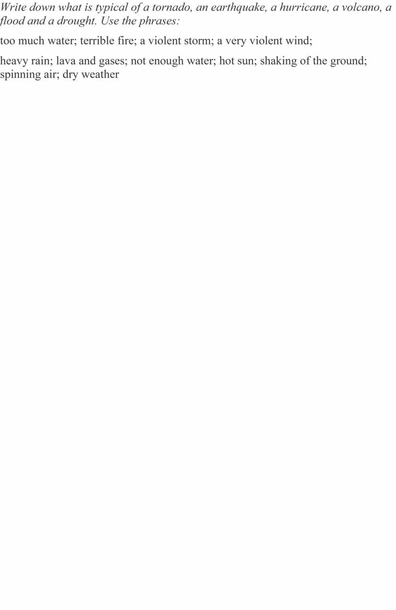 Write down what is typical of a tornado, an earthquake, a hurricane, a volcano, a flood and a drought. Use the phrases: