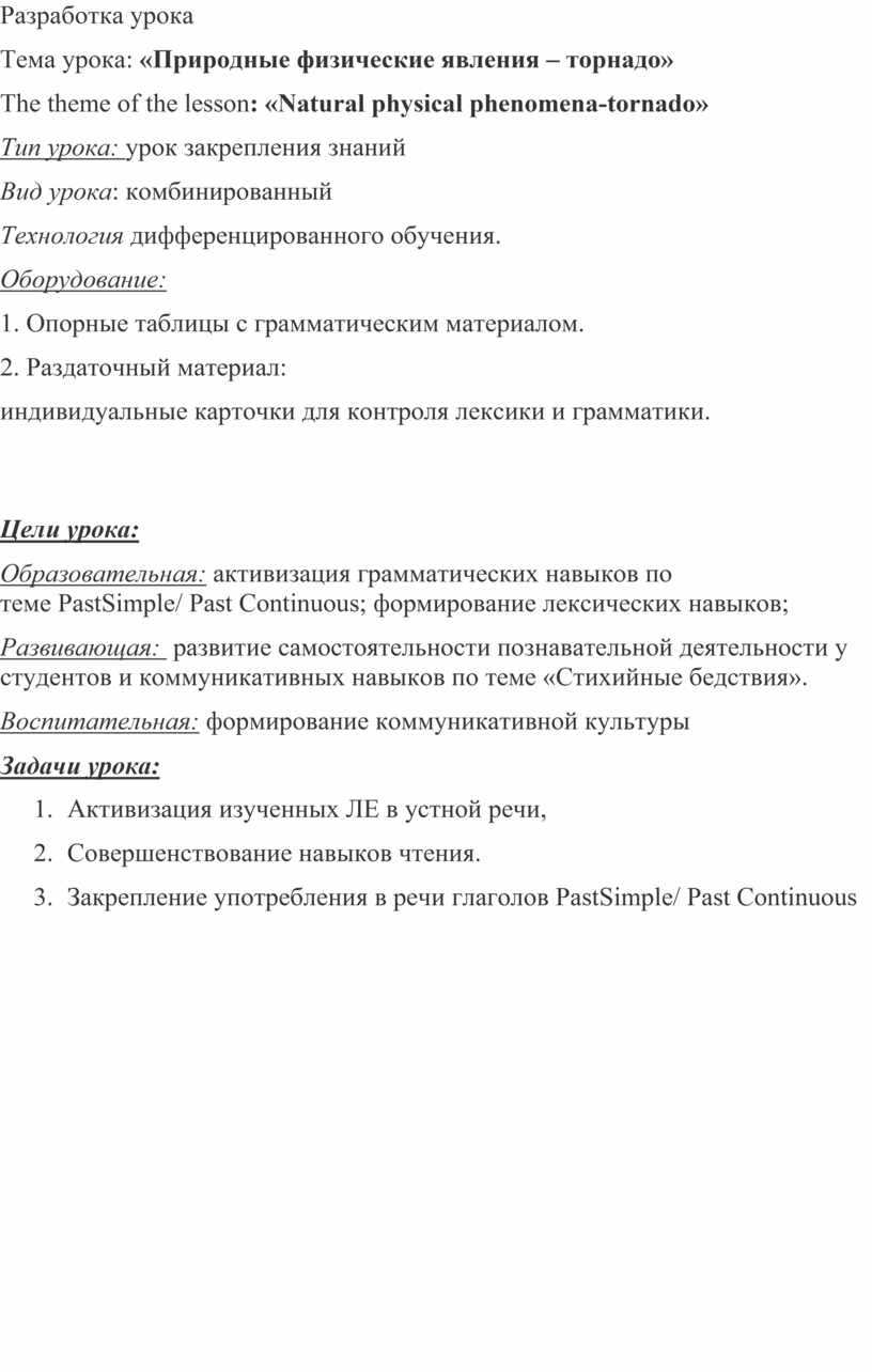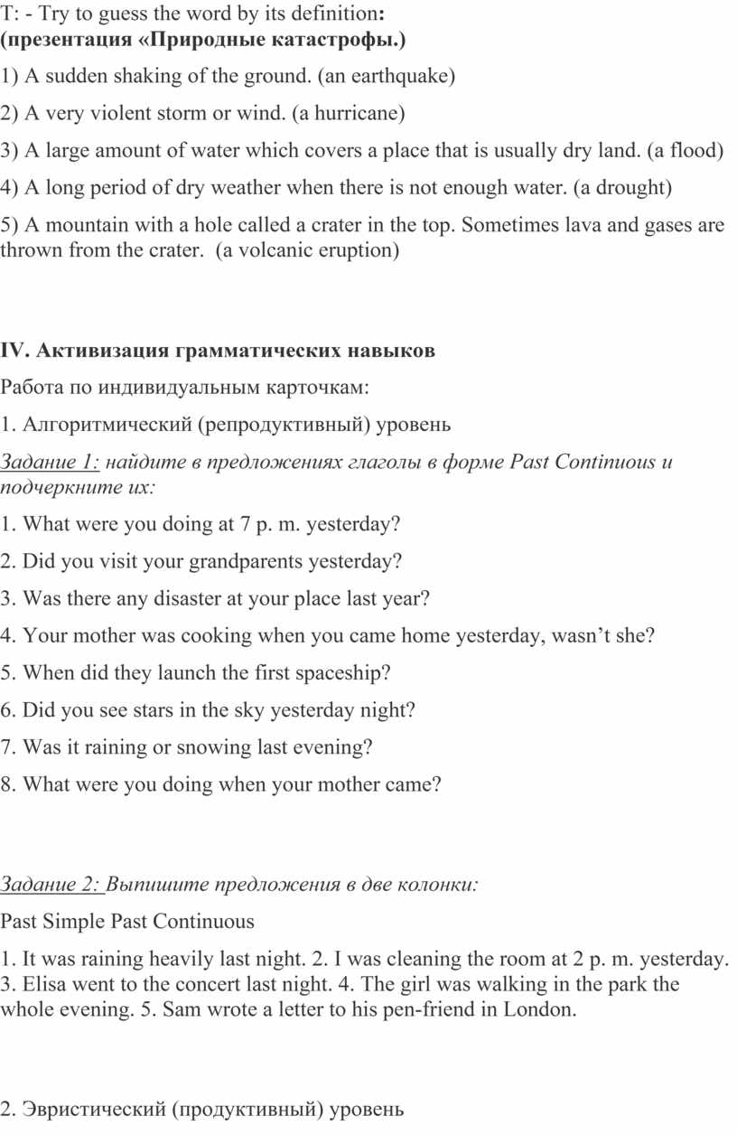 Т: - We are going to learn some information about tornadoes but first of all we must revise the tenses: Past Simple and Past Continuous.