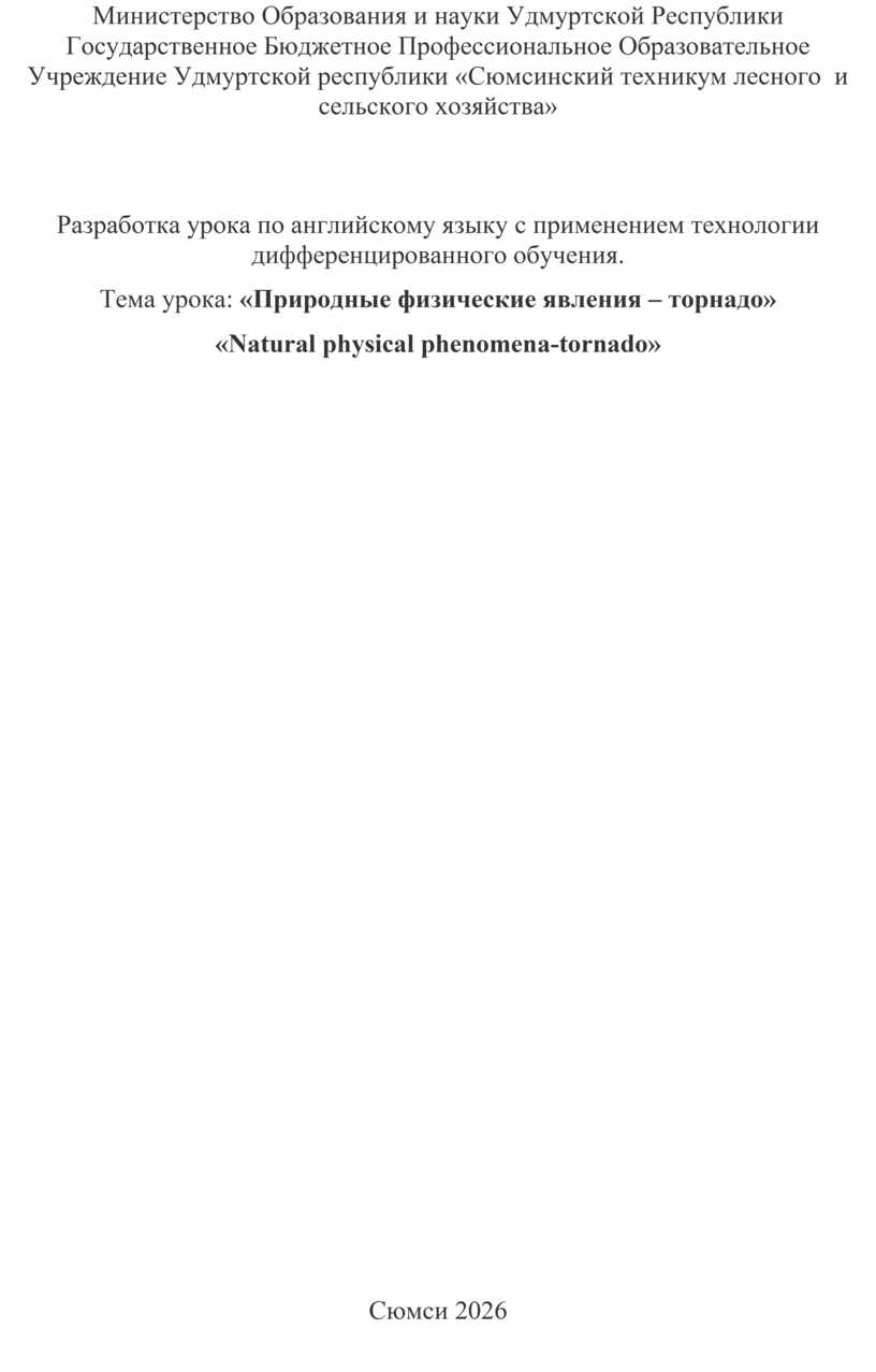 Министерство Образования и науки Удмуртской Республики Государственное Бюджетное Профессиональное Образовательное Учреждение Удмуртской республики «Сюмсинский техникум лесного и сельского хозяйства»