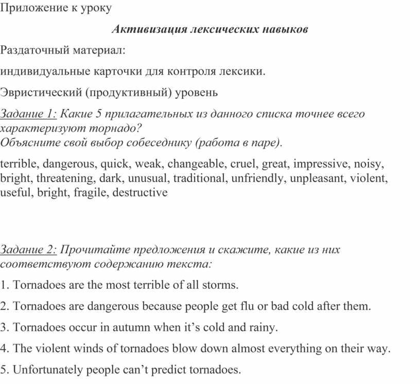 Задание 1: Какие 5 прилагательных из данного списка точнее всего характеризуют торнадо? Объясните свой выбор собеседнику (работа в паре).
