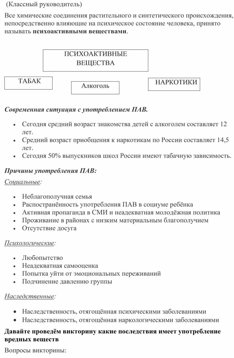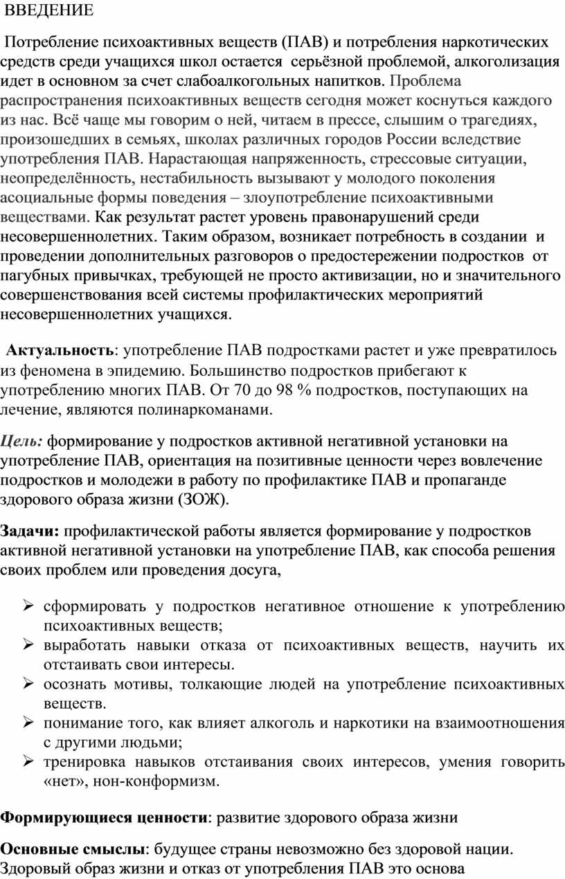 Потребление психоактивных веществ (ПАВ) и потребления наркотических средств среди учащихся школ остается серьёзной проблемой, алкоголизация идет в основном за счет слабоалкогольных напитков. Проблема распространения психоактивных веществ сегодня может коснуться каждого из нас. Всё чаще мы говорим о ней, читаем в прессе, слышим о трагедиях, произошедших в семьях, школах различных городов России вследствие употребления ПАВ. Нарастающая напряженность, стрессовые ситуации, неопределённость, нестабильность вызывают у молодого поколения асоциальные формы поведения – злоупотребление психоактивными веществами. Как результат растет уровень правонарушений среди несовершеннолетних. Таким образом, возникает потребность в создании и проведении дополнительных разговоров о предостережении подростков от пагубных привычках, требующей не просто активизации, но и значительного совершенствования всей системы профилактических мероприятий несовершеннолетних учащихся.