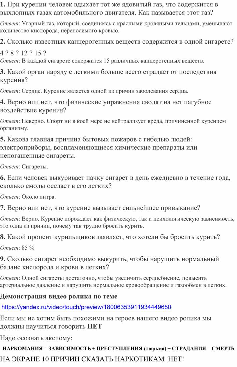 1. При курении человек вдыхает тот же ядовитый газ, что содержится в выхлопных газах автомобильного двигателя. Как называется этот газ?