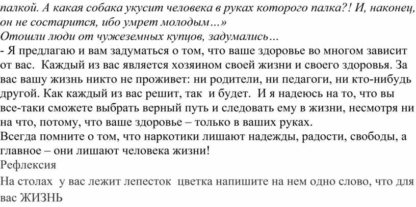 - Я предлагаю и вам задуматься о том, что ваше здоровье во многом зависит от вас. Каждый из вас является хозяином своей жизни и своего здоровья. За вас вашу жизнь никто не проживет: ни родители, ни педагоги, ни кто-нибудь другой. Как каждый из вас решит, так и будет. И я надеюсь на то, что вы все-таки сможете выбрать верный путь и следовать ему в жизни, несмотря ни на что, потому, что ваше здоровье – только в ваших руках.
