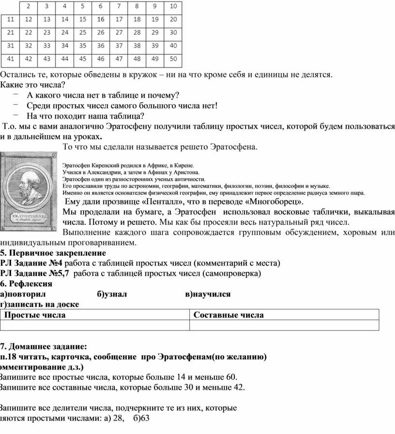 Т.о. мы с вами аналогично Эратосфену получили таблицу простых чисел, которой будем пользоваться и в дальнейшем на уроках.