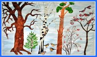 -Вот и лес! Как прекрасно и загадочно в лесу зимой! Могучие стоят дубы, зеленеют на фоне голубого неба сосны и ели. Лес в любое время интересен. Нужно быть только наблюдательным. Полюбуйтесь, присмотритесь. (Музыкальное сопровождение)