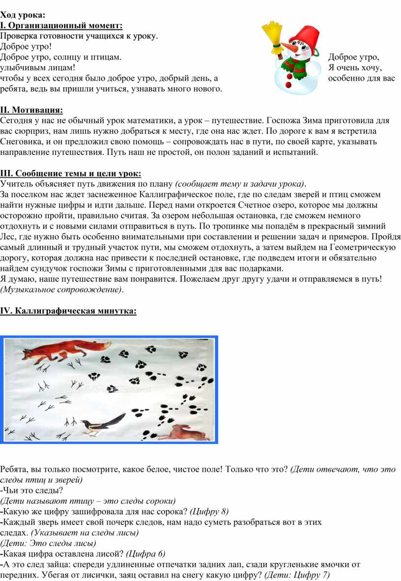 Сегодня у нас не обычный урок математики, а урок – путешествие. Госпожа Зима приготовила для вас сюрприз, нам лишь нужно добраться к месту, где она нас ждет. По дороге к вам я встретила Снеговика, и он предложил свою помощь – сопровождать нас в пути, по своей карте, указывать направление путешествия. Путь наш не простой, он полон заданий и испытаний.