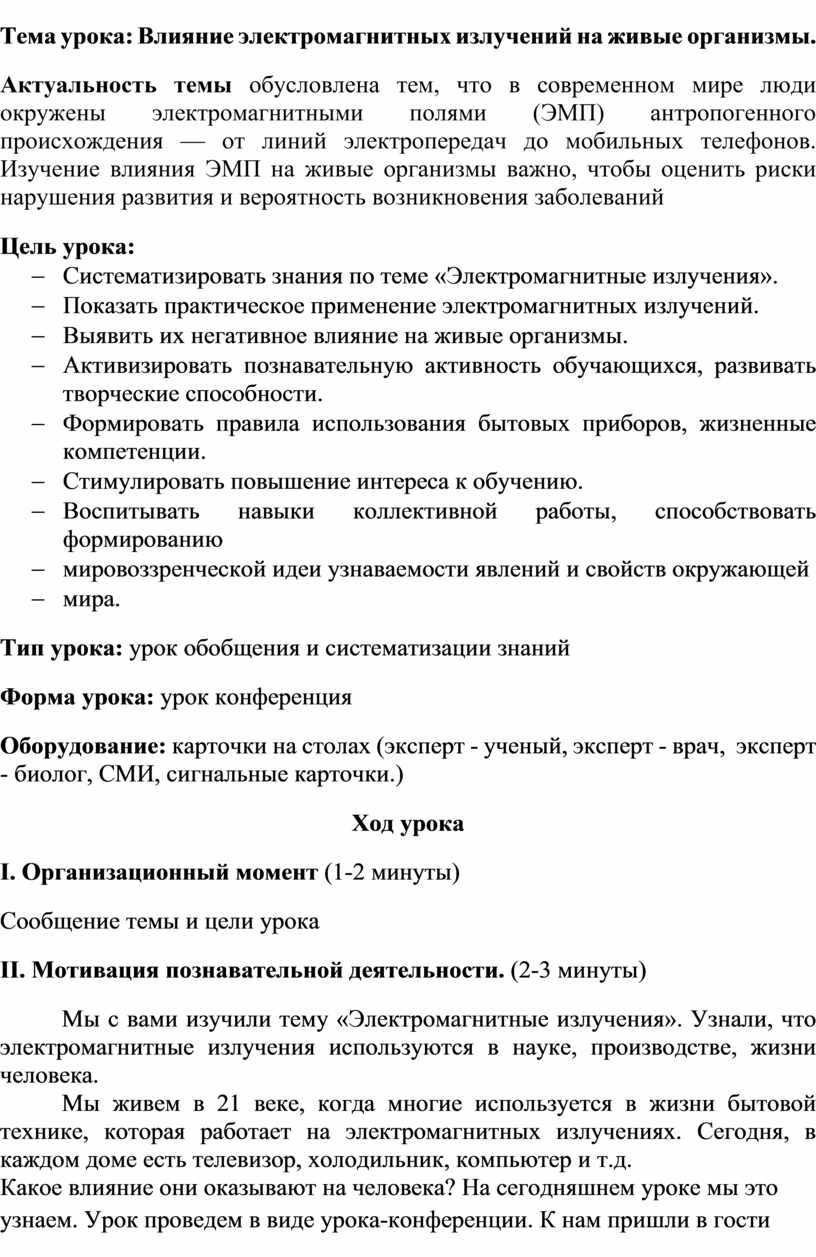 Какое влияние они оказывают на человека? На сегодняшнем уроке мы это узнаем. Урок проведем в виде урока-конференции. К нам пришли в гости ученые-эксперты, которые сообщат о влиянии на живые организмы электромагнитных излучений.