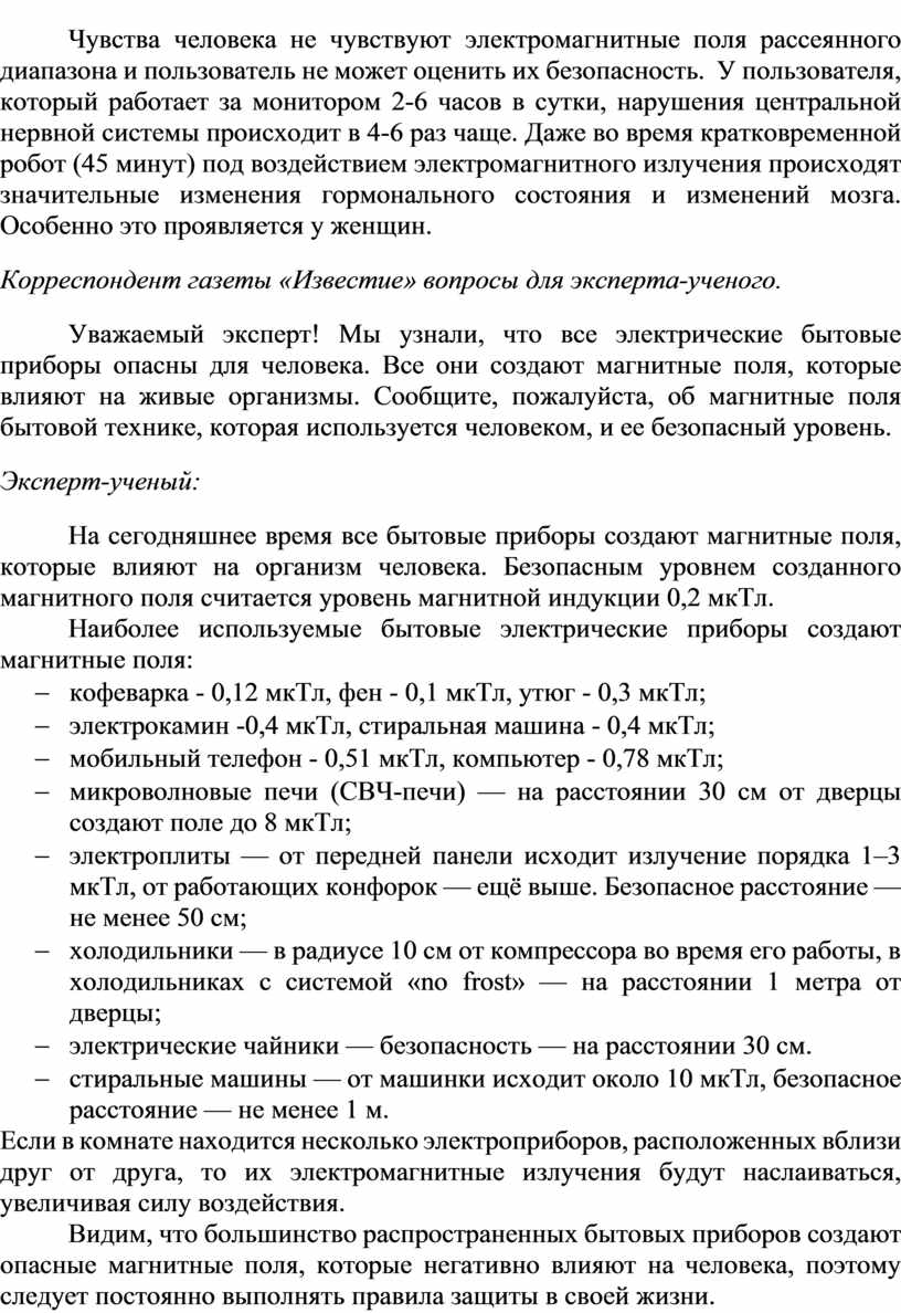 На сегодняшнее время все бытовые приборы создают магнитные поля, которые влияют на организм человека. Безопасным уровнем созданного магнитного поля считается уровень магнитной индукции 0,2 мкТл.