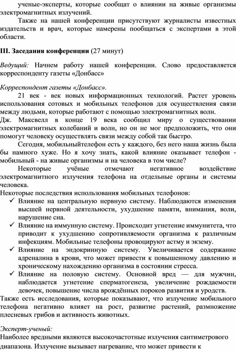 Ведущий: Во время конференции мы познакомились, что бытовые приборы к которым мы привыкли в своей жизни, негативно влияют на все живые организмы. Поэтому следует это помнить и беречь свое здоровье.