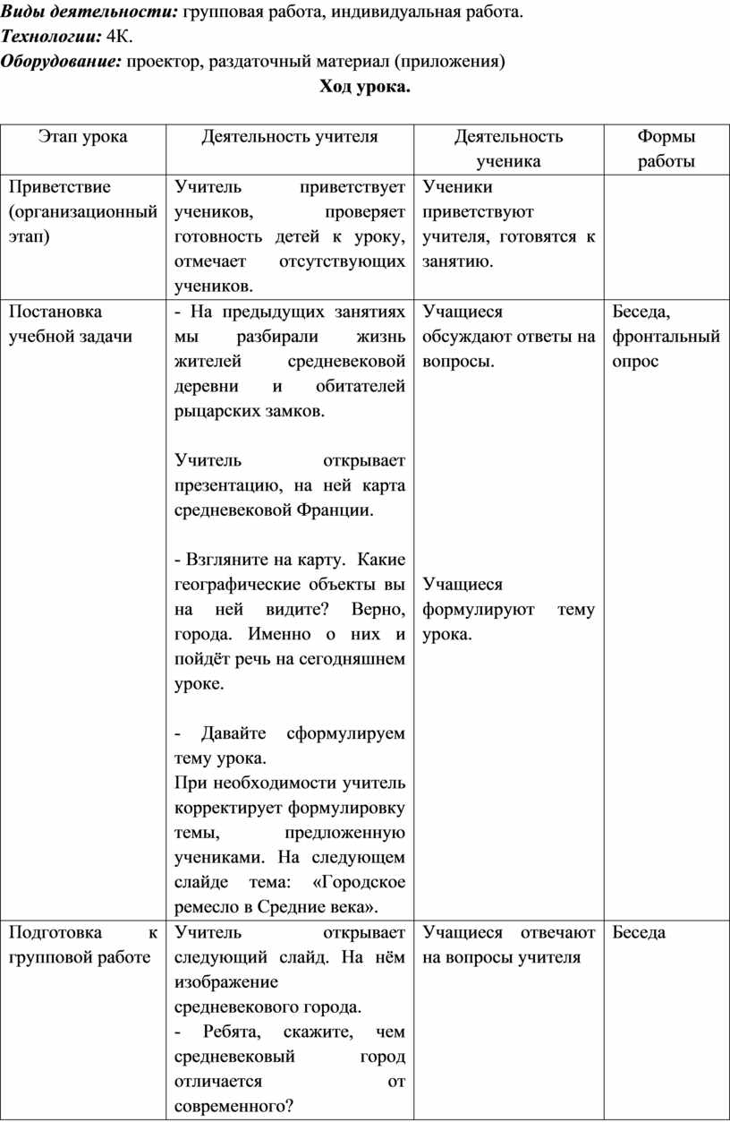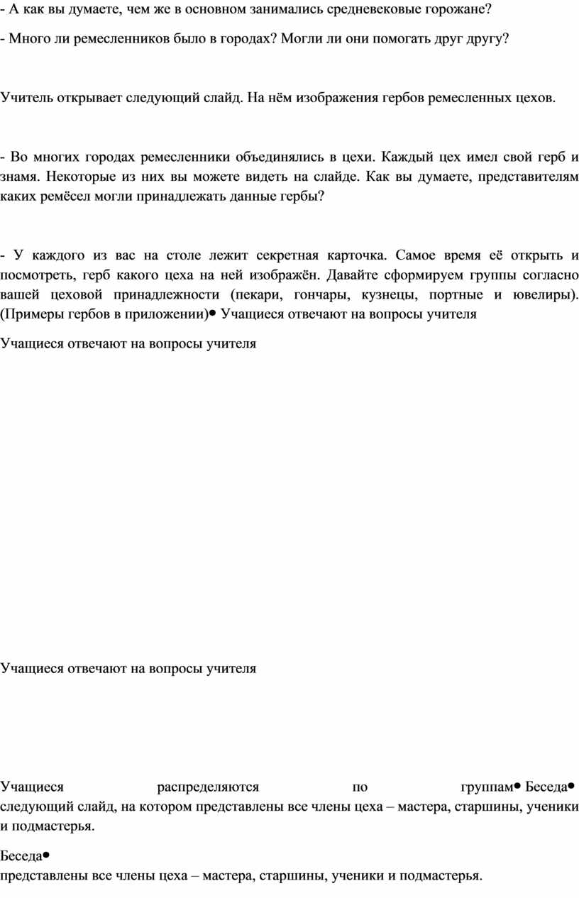 Учитель открывает следующий слайд. На нём изображение средневекового города. - Ребята, скажите, чем средневековый город отличается от современного? - А как вы думаете, чем же в основном занимались средневековые горожане? - Много ли ремесленников было в городах? Могли ли они помогать друг другу?
