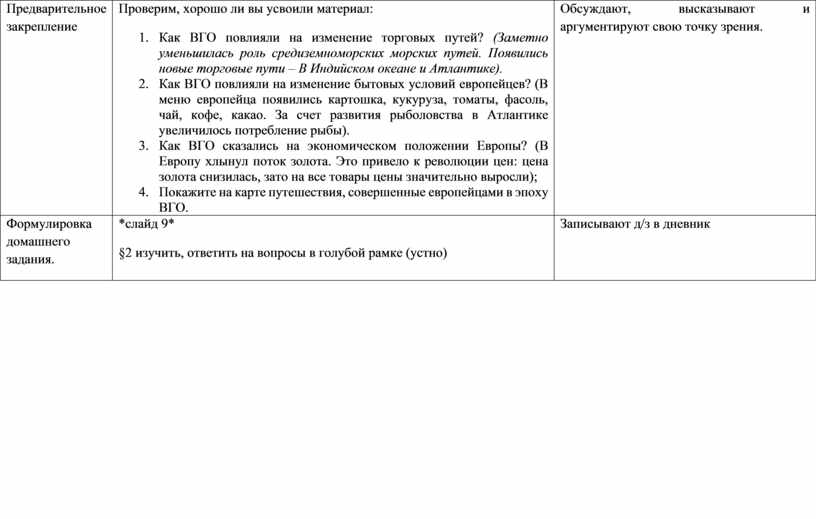 Проверим, хорошо ли вы усвоили материал: 1. Как ВГО повлияли на изменение торговых путей? (Заметно уменьшилась роль средиземноморских морских путей. Появились новые торговые пути – В Индийском океане и Атлантике). 2. Как ВГО повлияли на изменение бытовых условий европейцев? (В меню европейца появились картошка, кукуруза, томаты, фасоль, чай, кофе, какао. За счет развития рыболовства в Атлантике увеличилось потребление рыбы). 3. Как ВГО сказались на экономическом положении Европы? (В Европу хлынул поток золота. Это привело к революции цен: цена золота снизилась, зато на все товары цены значительно выросли); 4. Покажите на карте путешествия, совершенные европейцами в эпоху ВГО. |