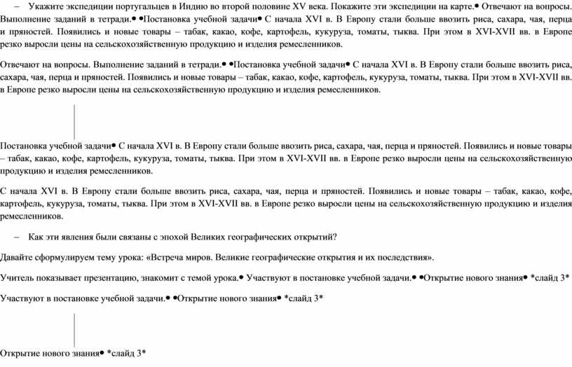 С начала XVI в. В Европу стали больше ввозить риса, сахара, чая, перца и пряностей. Появились и новые товары – табак, какао, кофе, картофель, кукуруза, томаты, тыква. При этом в XVI-XVII вв. в Европе резко выросли цены на сельскохозяйственную продукцию и изделия ремесленников. - Как эти явления были связаны с эпохой Великих географических открытий? Давайте сформулируем тему урока: «Встреча миров. Великие географические открытия и их последствия». Учитель показывает презентацию, знакомит с темой урока. |