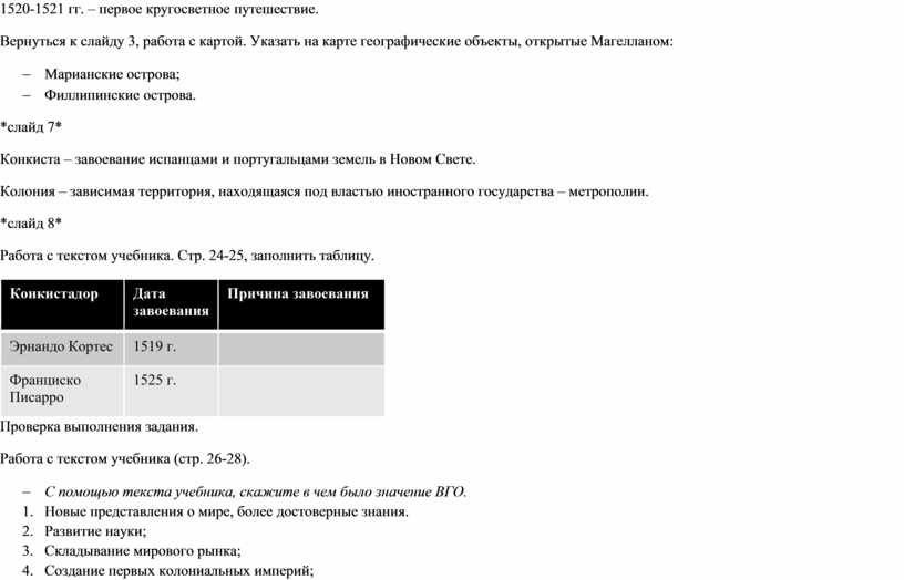 *слайд 5* 1503 г. – Америго Веспуччи доказал, что Колумб открыл новый континент. *слайд 6* 1520-1521 гг. – первое кругосветное путешествие. Вернуться к слайду 3, работа с картой. Указать на карте географические объекты, открытые Магелланом: - Марианские острова; - Филлипинские острова. *слайд 7* Конкиста – завоевание испанцами и португальцами земель в Новом Свете. Колония – зависимая территория, находящаяся под властью иностранного государства – метрополии. *слайд 8* Работа с текстом учебника. Стр. 24-25, заполнить таблицу.