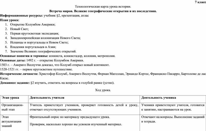 Технологическая карта урока истории.