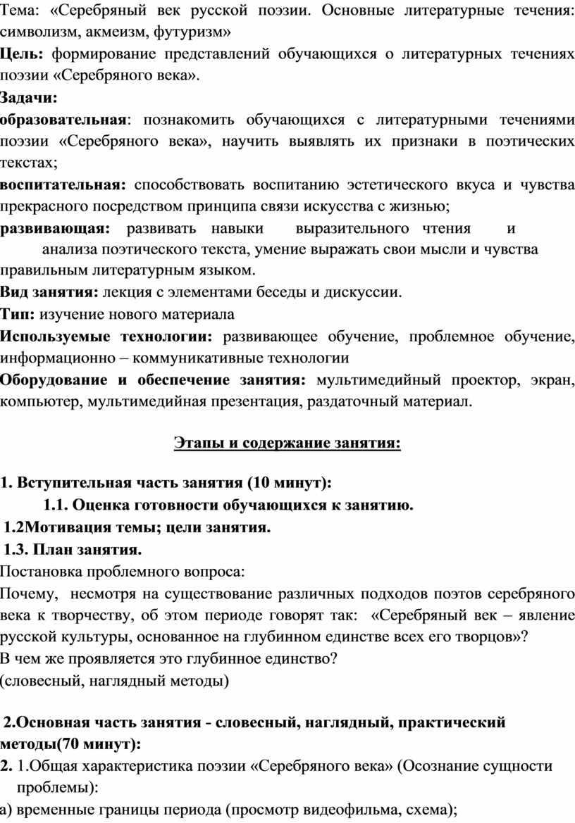 Методическая разработка учебного занятия по дисциплине «Литература» предназначена для организации урока, посвященного поэзии «Серебряного века». В основе занятия знакомство с литературными течениями начала XX века. Материал содержит информацию об основных исторических событиях, повлиявших на развитие литературы, об истоках происхождения символизма, акмеизма и футуризма, об их сходстве и различии.