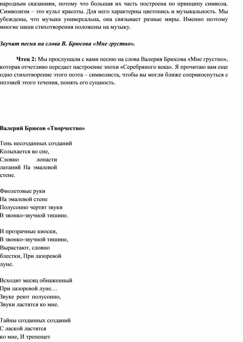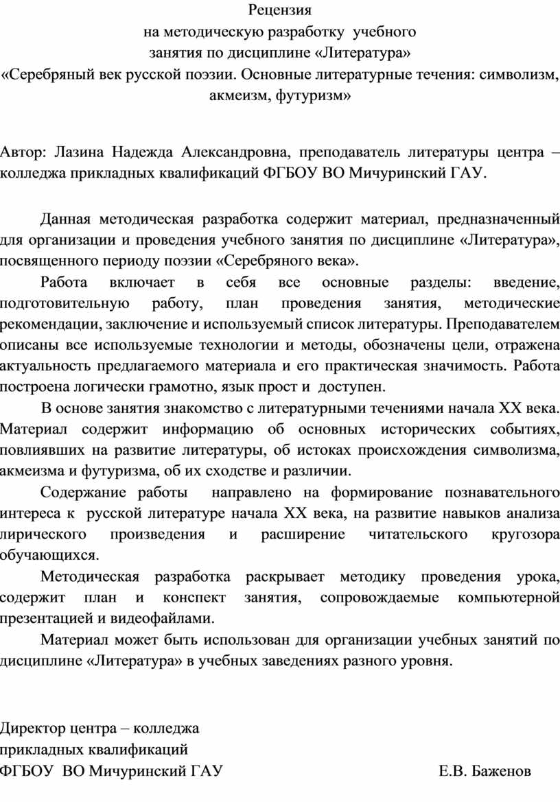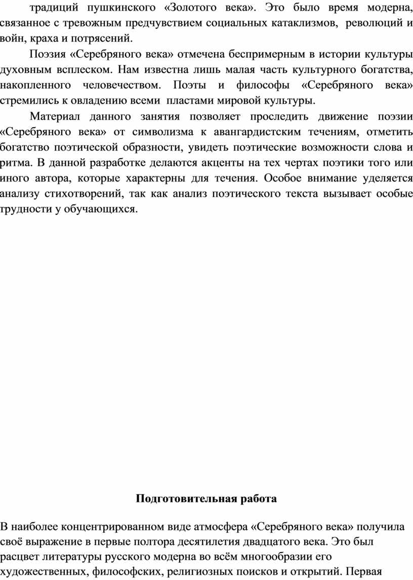 Материал данного занятия позволяет проследить движение поэзии «Серебряного века» от символизма к авангардистским течениям, отметить богатство поэтической образности, увидеть поэтические возможности слова и ритма. В данной разработке делаются акценты на тех чертах поэтики того или иного автора, которые характерны для течения. Особое внимание уделяется анализу стихотворений, так как анализ поэтического текста вызывает особые трудности у обучающихся.