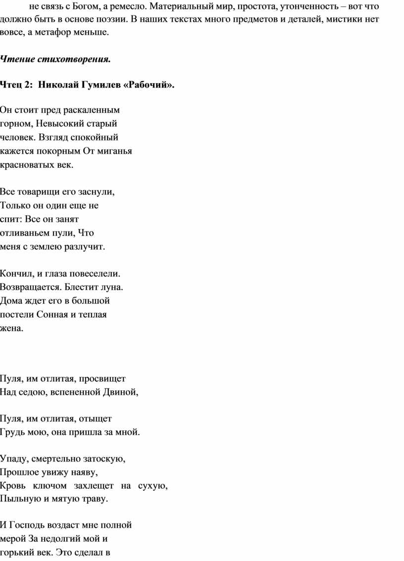 Чтец 3: Стихотворение «Рабочий» впервые было напечатано 1918 году. В то время Гумилев — еще молодой, но уже прошедший Первую Мировую войну, воин, размышляющий о смысле человеческого существования. Несмотря на то, что стихотворение написано в то время, когда акмеизм уже сдал свои позиции, поэт остался в нем верен своему течению. После первого прочтения стихотворения сразу понятен смысл и тема. Мы можем сказать, о чем оно. У нас есть конкретный герой – это рабочий, который занят отливанием пули. Первая строка стихотворения – своеобразный портрет главного героя: невысокий, старый, с покрасневшими от усталости глазами. Поэт как бы предчувствует свою смерть. Он убежден, что пуля, отлитая рабочим, найдет его на поле брани. В эту минуту вся жизнь пронесется у него перед глазами. В последних строчках стихотворения в образе рабочего представлена смерть.