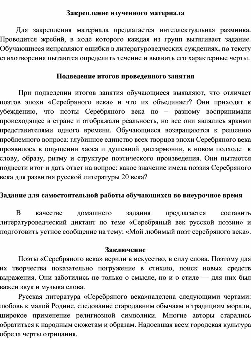 При подведении итогов занятия обучающиеся выявляют, что отличает поэтов эпохи «Серебряного века» и что их объединяет? Они приходят к убеждению, что поэты Серебряного века по – разному воспринимали происходящее в стране и отображали реальность, но все они являлись яркими представителями одного времени. Обучающиеся возвращаются к решению проблемного вопроса: глубинное единство всех творцов эпохи Серебряного века проявилось в ощущении хаоса и душевной дисгармонии, в новом подходе к слову, образу, ритму и структуре поэтического произведения. Они пытаются подвести итог и дать ответ на вопрос: какое значение имела поэзия Серебряного века для развития русской литературы 20 века?