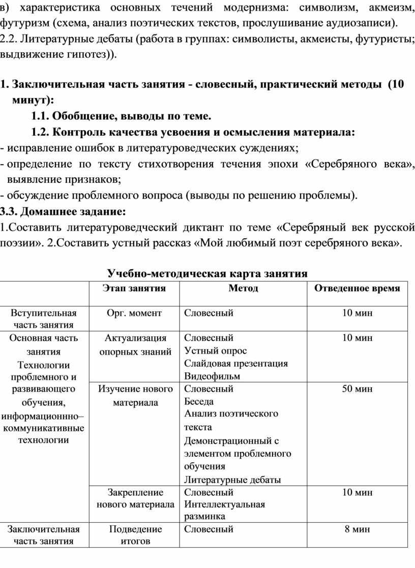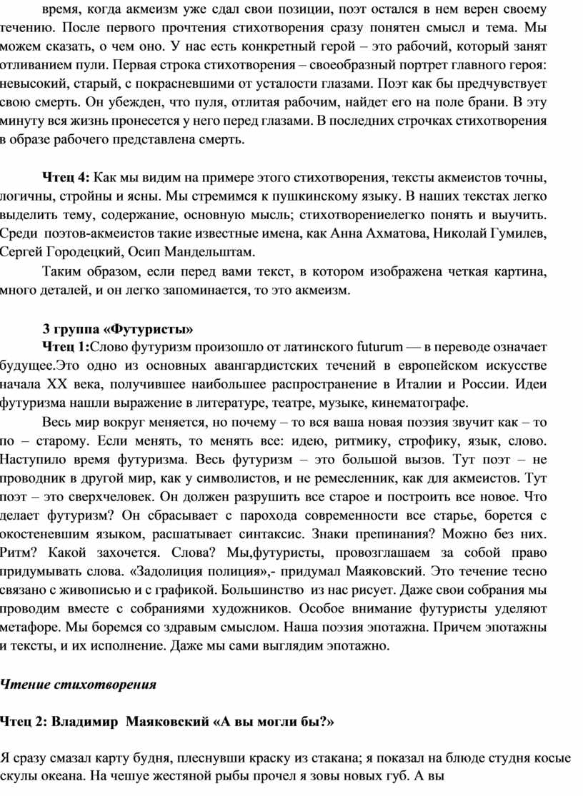 Условно все обучающиеся делятся на три группы. Каждая группа представляет собой конкретное течение: символисты, акмеисты, футуристы. Предварительно к занятию каждой группе необходимо подготовить материал, который позволил бы им раскрыть сущность своего течения. Группы должны подготовиться к литературным дебатам и доказать, что именно их течение имеет преимущество перед всеми остальными.