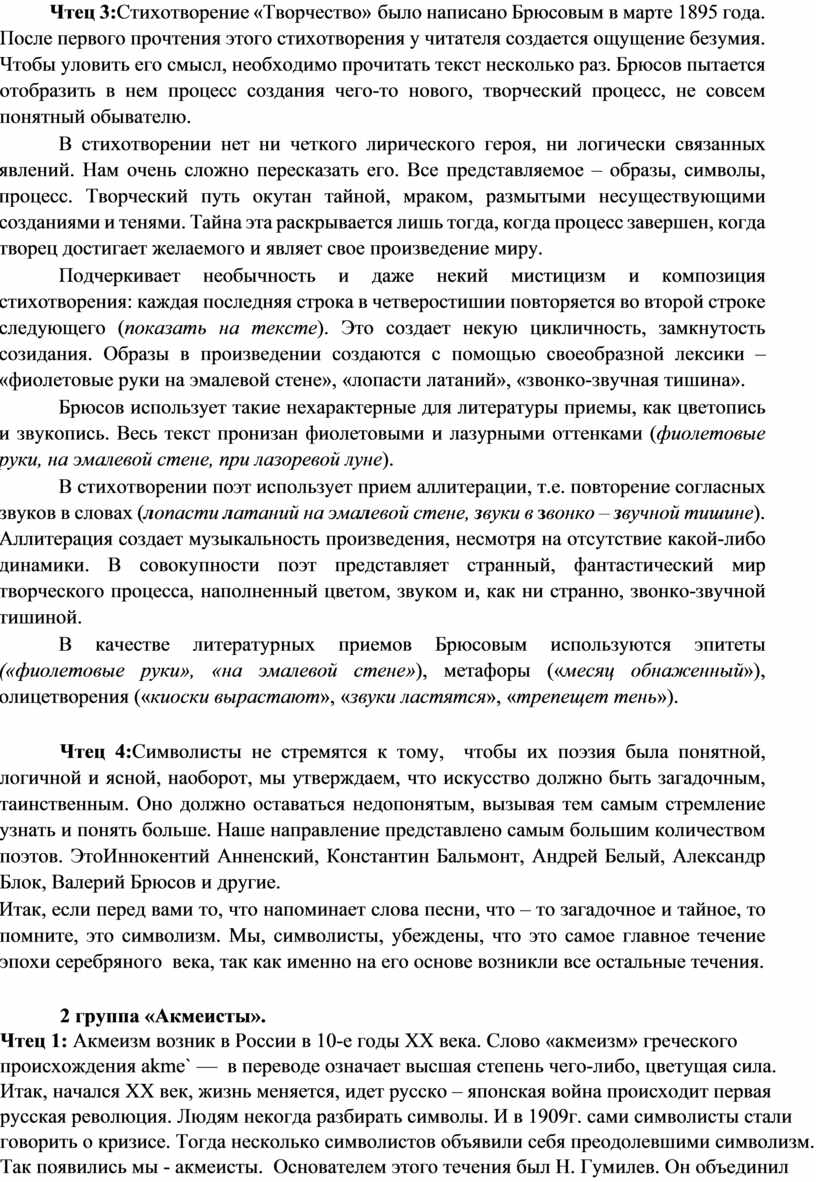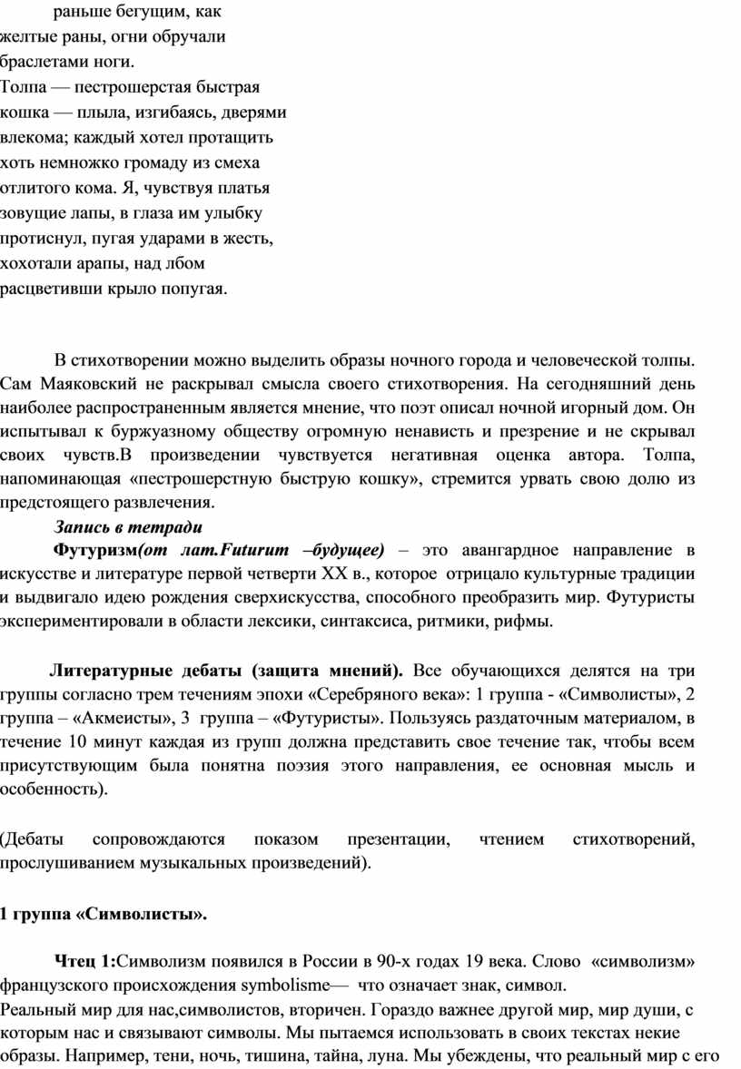 Следующий этап занятия – литературные дебаты. В них участвуют три группы: символисты, акмеисты, футуристы. Пользуясь раздаточным материалом и своей заранее подготовленной информацией, каждая группа должна как можно ярче представить свое течение и доказать его преимущество перед остальными. Обучающиеся выявляют особенности, читают характерные стихотворения и анализируют их. Отличительные черты каждого течения записываются в тетрадь. В ходе дебатов оппоненты выдвигают разные гипотезы.