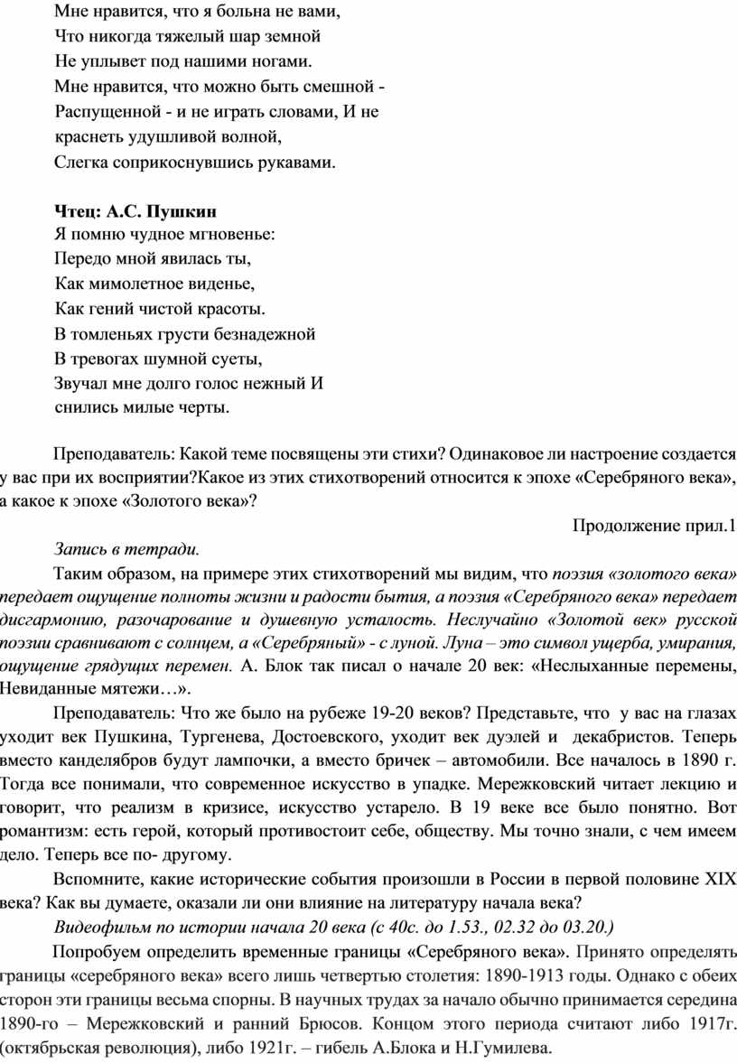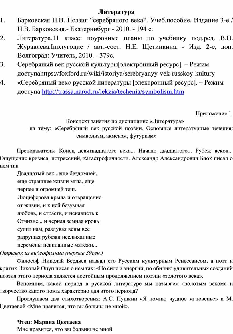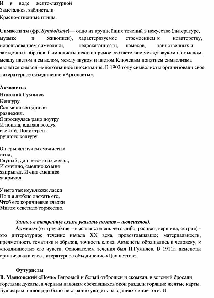 Цель: формирование представлений обучающихся о литературных течениях поэзии «Серебряного века».