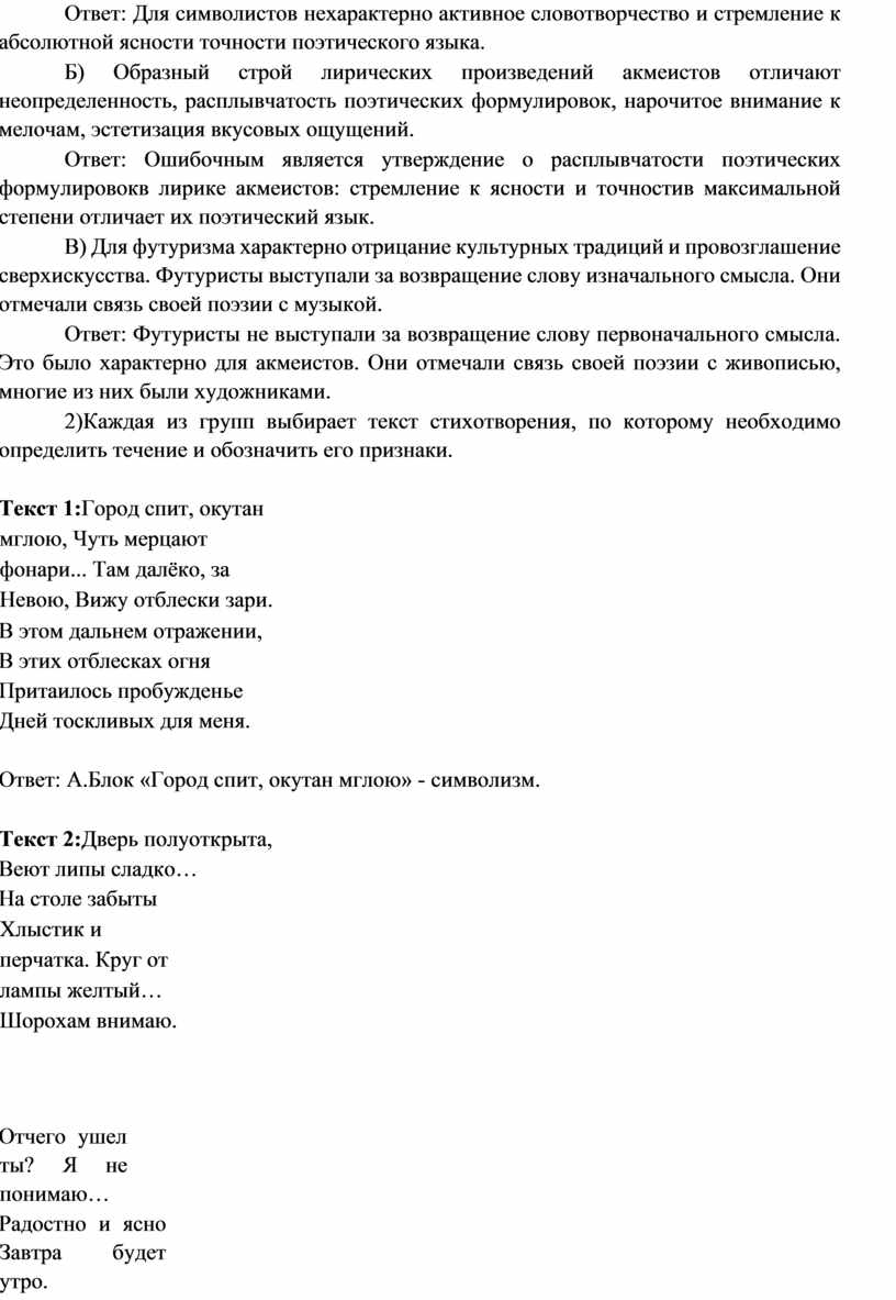 А)Для поэтического языка символистов были характерны повышенная музыкальность, активное словотворчество (создание неологизмов), тяготение к ясному и четкому пушкинскому стилю.