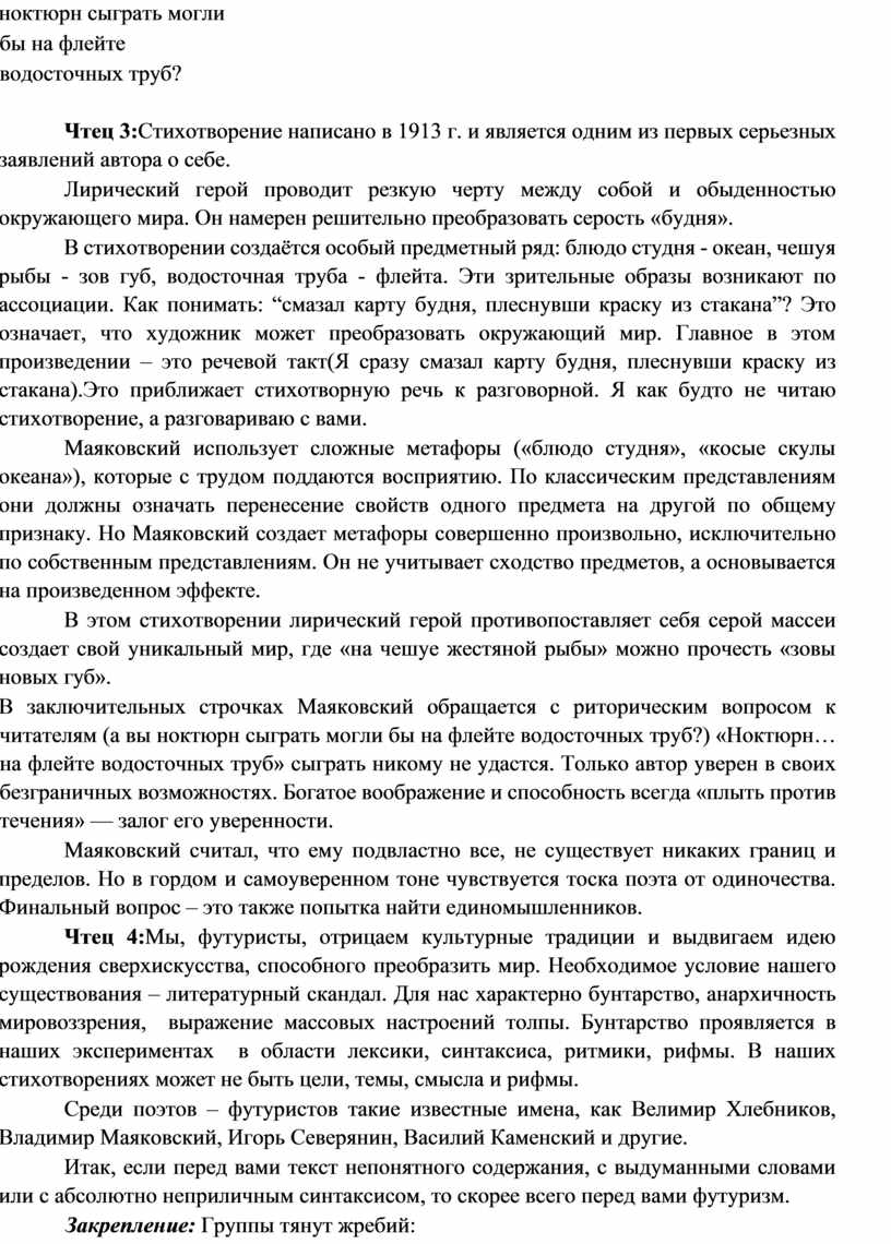 2)Каждая из групп выбирает текст стихотворения, по которому необходимо определить течение и обозначить его признаки.
