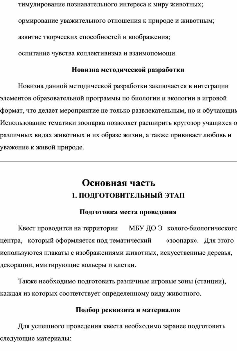 Новизна данной методической разработки заключается в интеграции элементов образовательной программы по биологии и экологии в игровой формат, что делает мероприятие не только развлекательным, но и обучающим. Использование тематики зоопарка позволяет расширить кругозор учащихся о различных видах животных и их образе жизни, а также прививает любовь и уважение к живой природе.