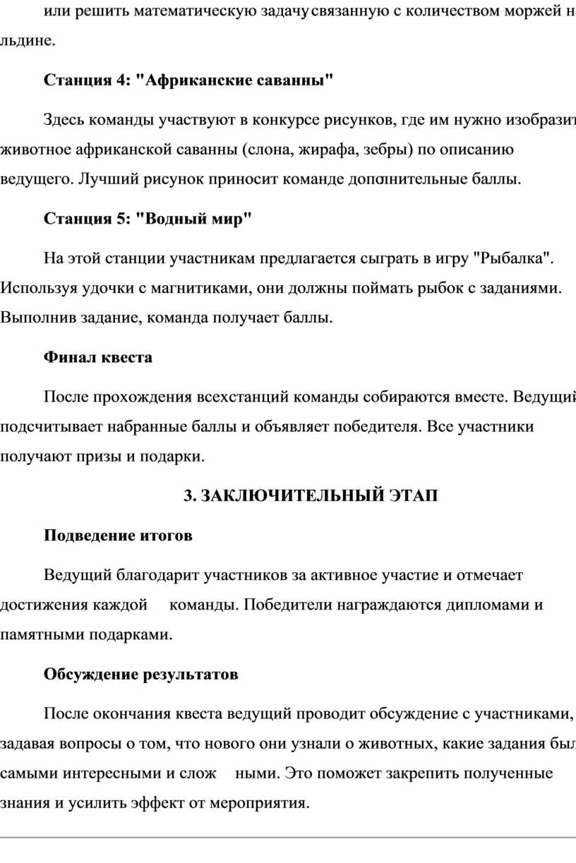 После окончания квеста ведущий проводит обсуждение с участниками, задавая вопросы о том, что нового они узнали о животных, какие задания были самыми интересными и сложными. Это поможет закрепить полученные знания и усилить эффект от мероприятия.