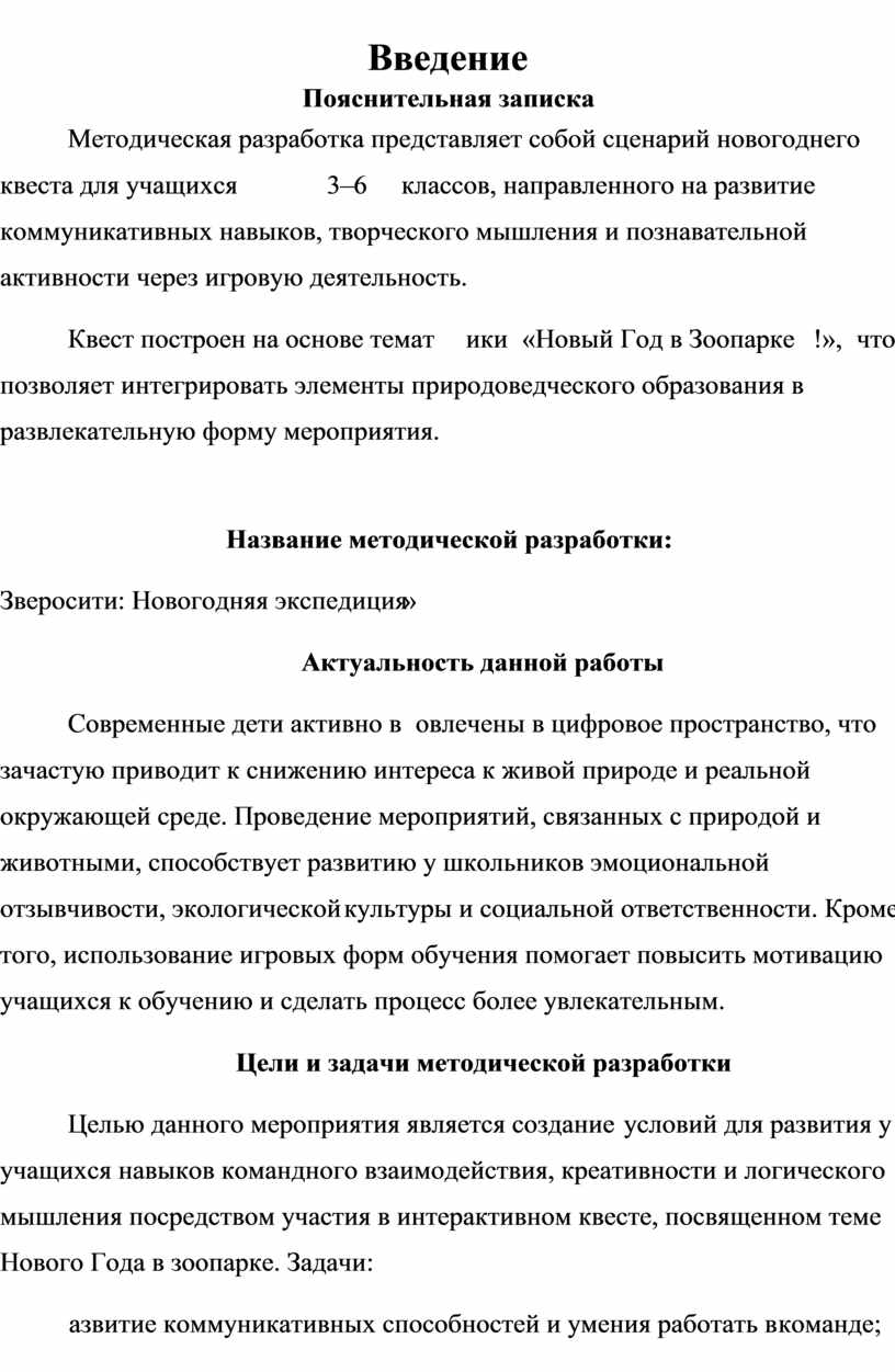 Методическая разработка представляет собой сценарий новогоднего квеста для учащихся 3–6 классов, направленного на развитие коммуникативных навыков, творческого мышления и познавательной активности через игровую деятельность.