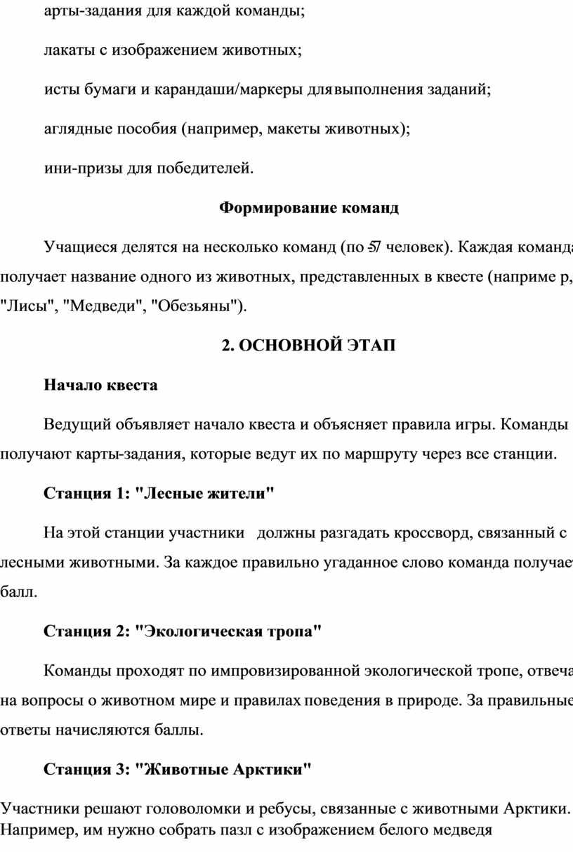 Учащиеся делятся на несколько команд (по 5-7 человек). Каждая команда получает название одного из животных, представленных в квесте (например, "Лисы", "Медведи", "Обезьяны").
