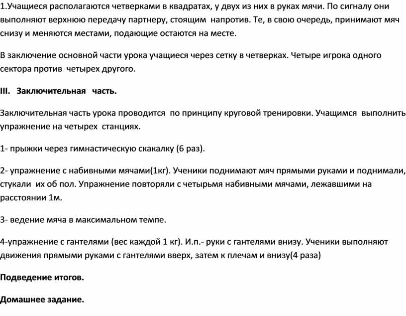 Заключительная часть урока проводится по принципу круговой тренировки. Учащимся выполнить упражнение на четырех станциях.