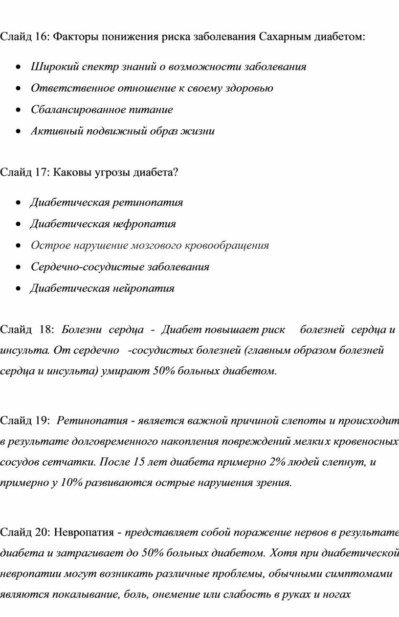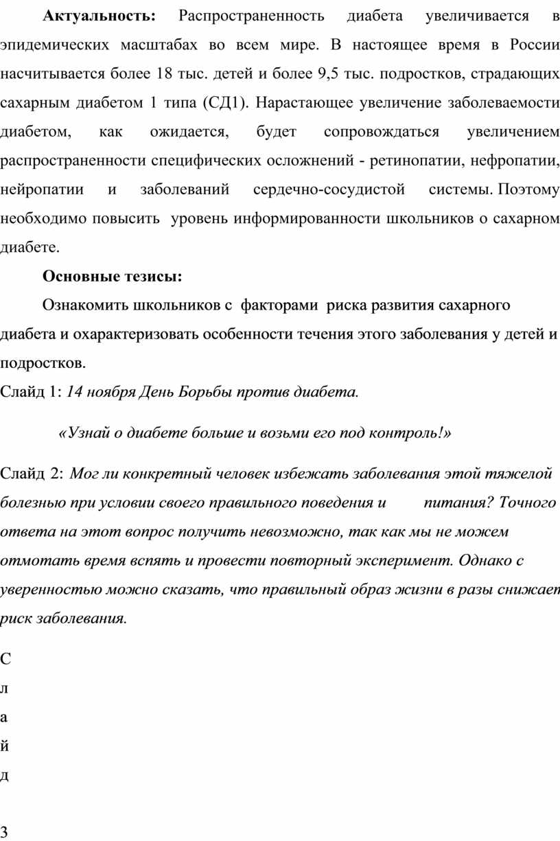 Ознакомить школьников с факторами риска развития сахарного диабета и охарактеризовать особенности течения этого заболевания у детей и подростков.
