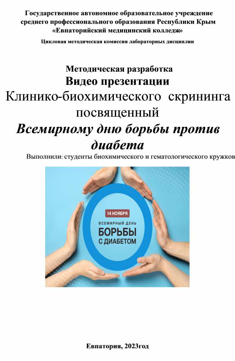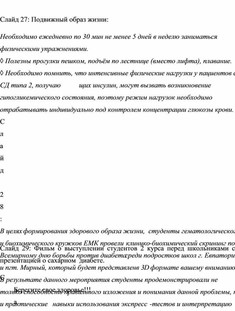 Слайд 28: В целях формирования здорового образа жизни, студенты гематологического и биохимического кружков ЕМК провели клинико-биохимический скрининг по Всемирному дню борьбы против диабета среди подростков школ г. Евпатории и пгт. Мирный, который будет представлен в 3D формате вашему вниманию. В результате данного мероприятия студенты продемонстрировали не только способность правильного изложения и понимания данной проблемы, но и практические навыки использования экспресс-тестов и интерпретацию полученных результатов, что способствовало привлечению интереса школьников не только к проблеме сахарного диабета, но и к прекрасной специальности лабораторный техник.