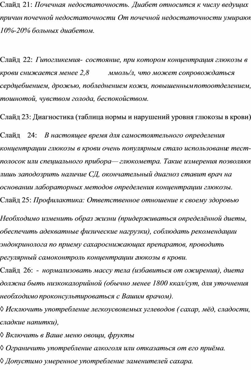 Слайд 22: Гипогликемия- состояние, при котором концентрация глюкозы в крови снижается менее 2,8 ммоль/л, что может сопровождаться сердцебиением, дрожью, побледнением кожи, повышенным потоотделением, тошнотой, чувством голода, беспокойством.