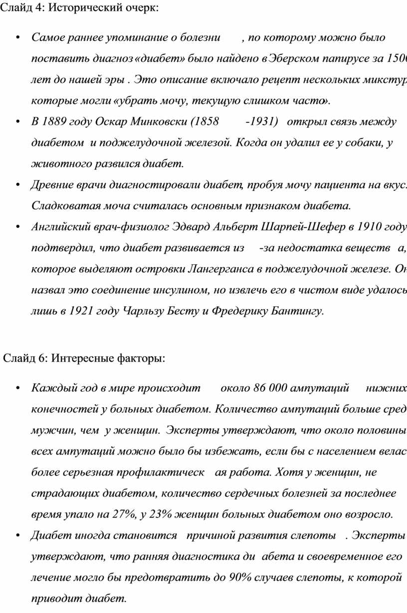 • Английский врач-физиолог Эдвард Альберт Шарпей-Шефер в 1910 году подтвердил, что диабет развивается из-за недостатка вещества, которое выделяют островки Лангерганса в поджелудочной железе. Он назвал это соединение инсулином, но извлечь его в чистом виде удалось лишь в 1921 году Чарльзу Бесту и Фредерику Бантингу.